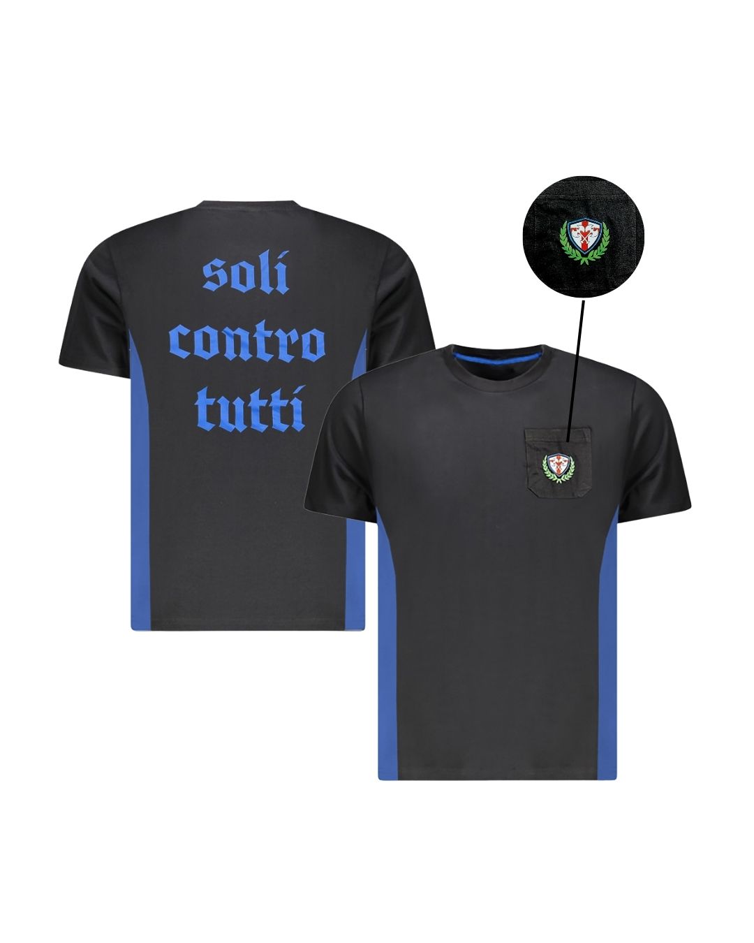 Stampa posteriore con scritta “SOLI CONTRO TUTTI” in blu elettrico.